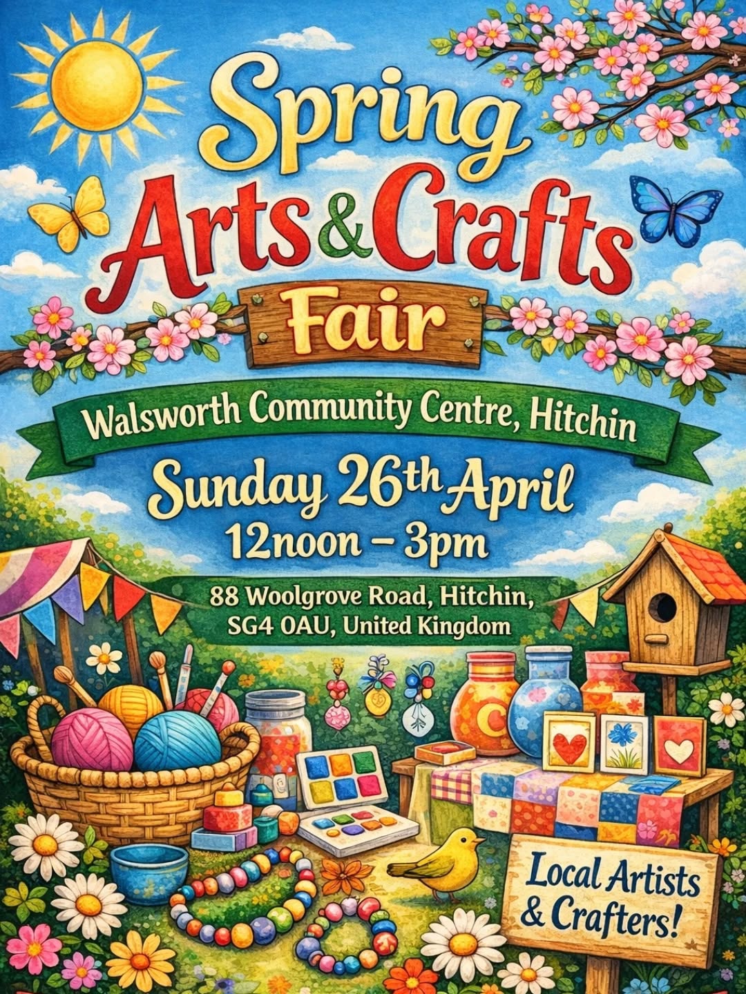 We are inviting local makers and crafters to be part of our Spring Arts & Crafts Fair at Walsworth Community Centre, Hitchin on Sunday 26th April (12–3pm).